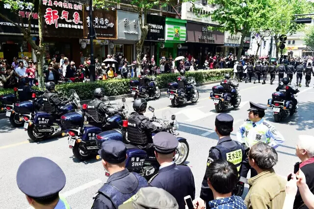 最后来一张交警蜀黍为彩车开道的照片,好酷炫! |