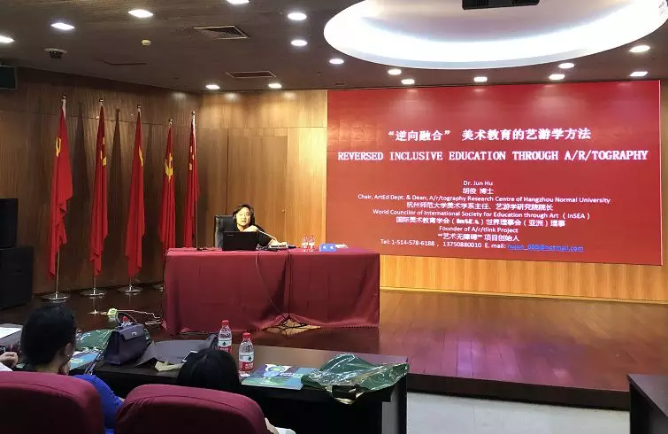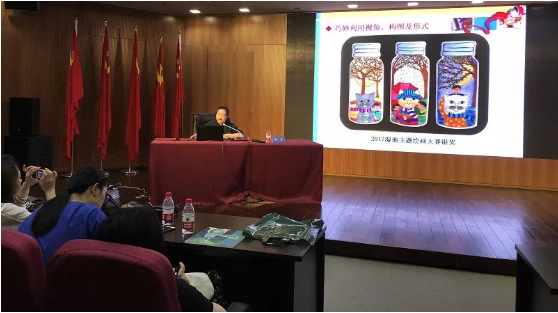 知名漫画家阮筠庭分享经验 国际美术教育学会(inSEA)世界理事会(亚洲)理事胡俊从理论专业的角度,向在座的老师们介绍了“逆向融合”美术教育的艺游学方法,通过丰富的试验与案例,剖析了以特殊孩子为教育中心辐散到普通孩子的“逆向融合”教育方式以及回归自然,结合实践的艺游学理念,让在座的老师们受到了不少启发。