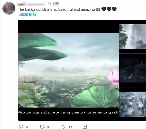 《魔道祖师》在开播前就获得了“国漫之光”的称号,《魔道祖师》动画上线后,用“新古风,真国漫”的作品紧紧把握住文化潮流趋势,引领一场新的古风与国漫的风潮,展现出国漫的闪光力量。 《魔道祖师》动画凭借行云流水的中国式武术打斗、水墨韵味的画面、琴笛结合的配乐等也得到海外观众的一致好评,在日本、泰国、越南、美国等国家的动漫爱好群体中引起了极高的关注度。网友们还在社交平台上热情地讨论动画剧情,为动画疯狂“打call”,印证了作品本身所拥有的高水准和鲜明特质。