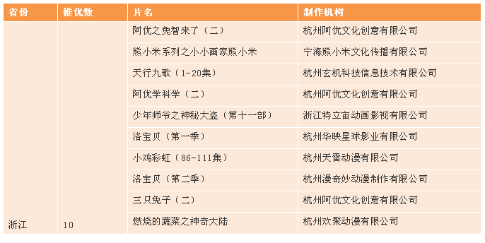 国家广播电视总局关于2017年度全国电视动画片制作发行情况的通告 根据电视动画片管理的有关规定,现将国家广播电视总局电视动画片审查委员会、各省级电视动画片审查机构,以及受总局委托的中央广播电视总台电视动画片审查机构2017年度审查发行的国产电视动画片情况予以通告。 附件: 1.2017年度核发《国产电视动画片发行许可证》目录.doc 2.2017年度推荐播出优秀动画片目录.doc 国家广播电视总局 2018年8月27日 来跟着国漫君一起来看看,是哪8部杭州动画片获得总局推优了吧: 阿优之兔智来了(二) 杭州阿优文化创意有限公司 故事讲述的是阿U和他的小伙伴们看守的那颗巨大的超级萝卜有天突然变小了,大家致电博士。为了帮助大家,博士送来一只名叫兔智的机器人,它不仅智慧超群,还拥有各种能力。