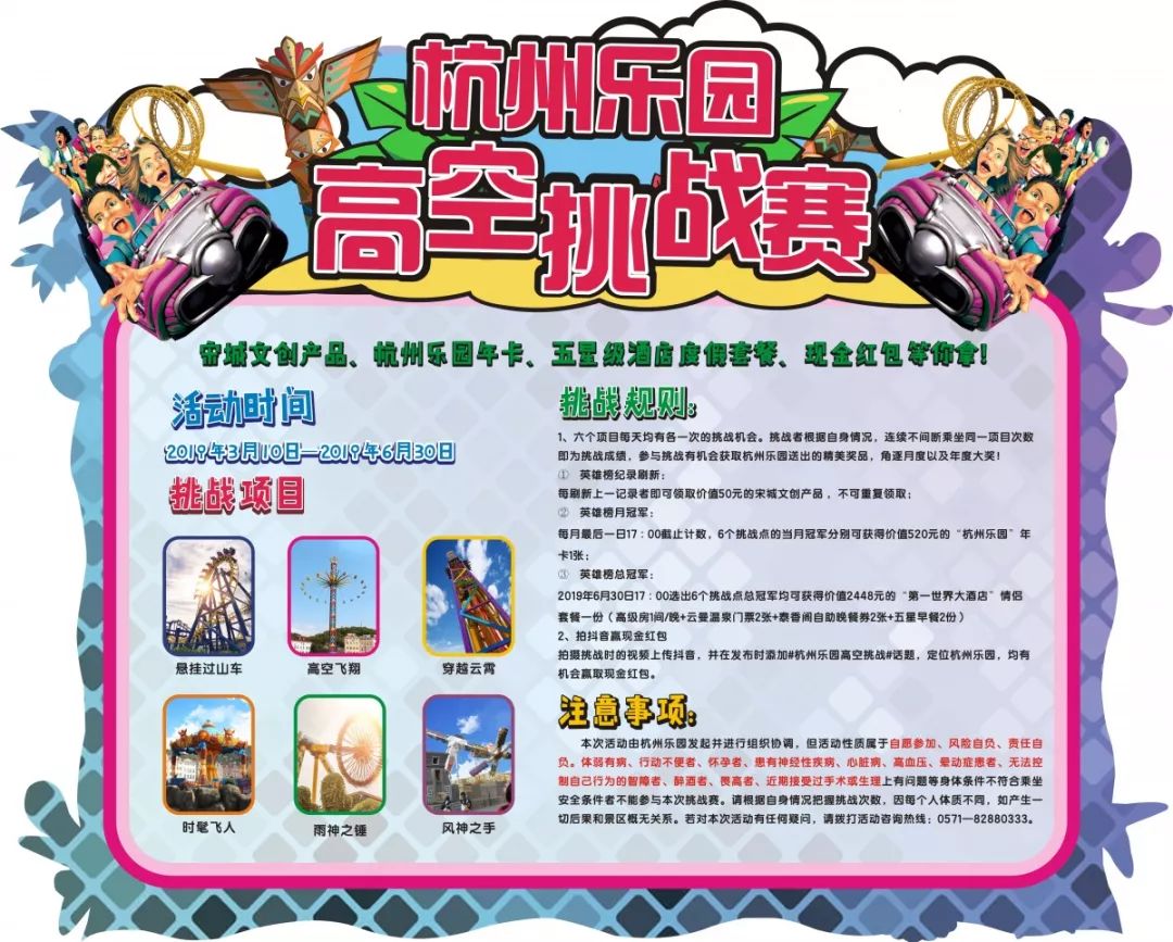 高空挑战赛,激情重燃 即日起至6月30日,购买杭州乐园门票的游客,均可参与挑战活动,赢取惊喜大奖。 挑战项目:悬挂过山车、高空飞翔、穿越云霄、时髦飞人、雨神之锤、风神之手