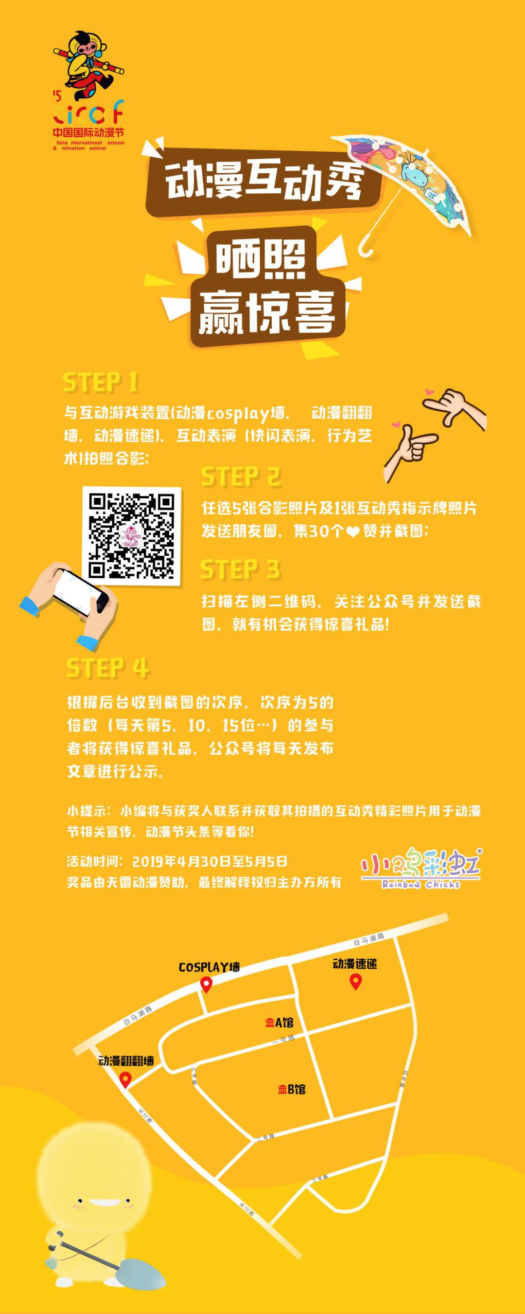 掌握互动秀精髓 get隐藏新玩法! 拍拍照 → 点点赞 → 赢惊喜 简单3步走,礼品、头条等你有! 戳下方了解详细规则: 动漫节期间,主会场周边将会设立互动游戏装置(动漫cosplay墙、 动漫翻翻墙、动漫速递)并进行互动表演(快闪表演、行为艺术表演),集齐5张场景合影+互动秀海报照片发朋友圈集齐30个赞,关注海报上方二维码并发送朋友圈截图即可参与盖楼。根据后台收图次序,以5的倍数抽取幸运儿,公众号将每天发布获奖名单。Ps.小编将与获奖者联系并获取其拍摄的互动秀精彩照片用于动漫节相关宣传,动漫头条等你哦!