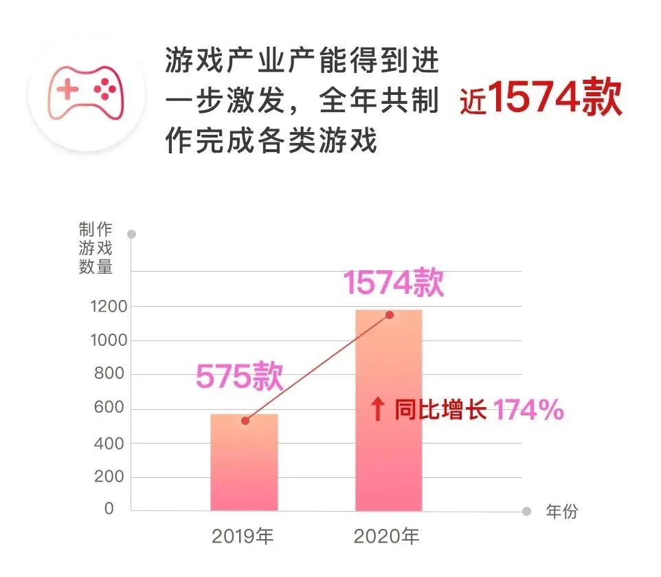 游戏产业异军突起,全年共制作完成各类游戏近1574款,数量比2019年同比增长174%。产值大幅增长的背后,是以数字化为强劲引擎的产能大幅提升,网易雷火、中南卡通、电魂网络、博采传媒等企业探索应用5G、人工智能、云计算等高科技,大幅度降低制作成本,提升生产效率。