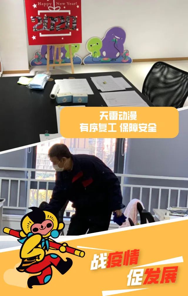 疫情期间,杭州阿优文化科技有限公司的科普动画团队通过居家协作办公先后创作了4部防疫科普作品,积极发挥了科普动画在疫情防控中的作用。 2月17日正式复工后,阿优文化举办表彰会,对疫情期间表现出色的优秀工作者进行了表彰。为做好复工防护,公司制定了严格的复工预案,每日三次消毒,保障充足的防护物资,对所有员工健康状况进行统计排查。公司还将新招聘100多名员工。 天雷动漫
