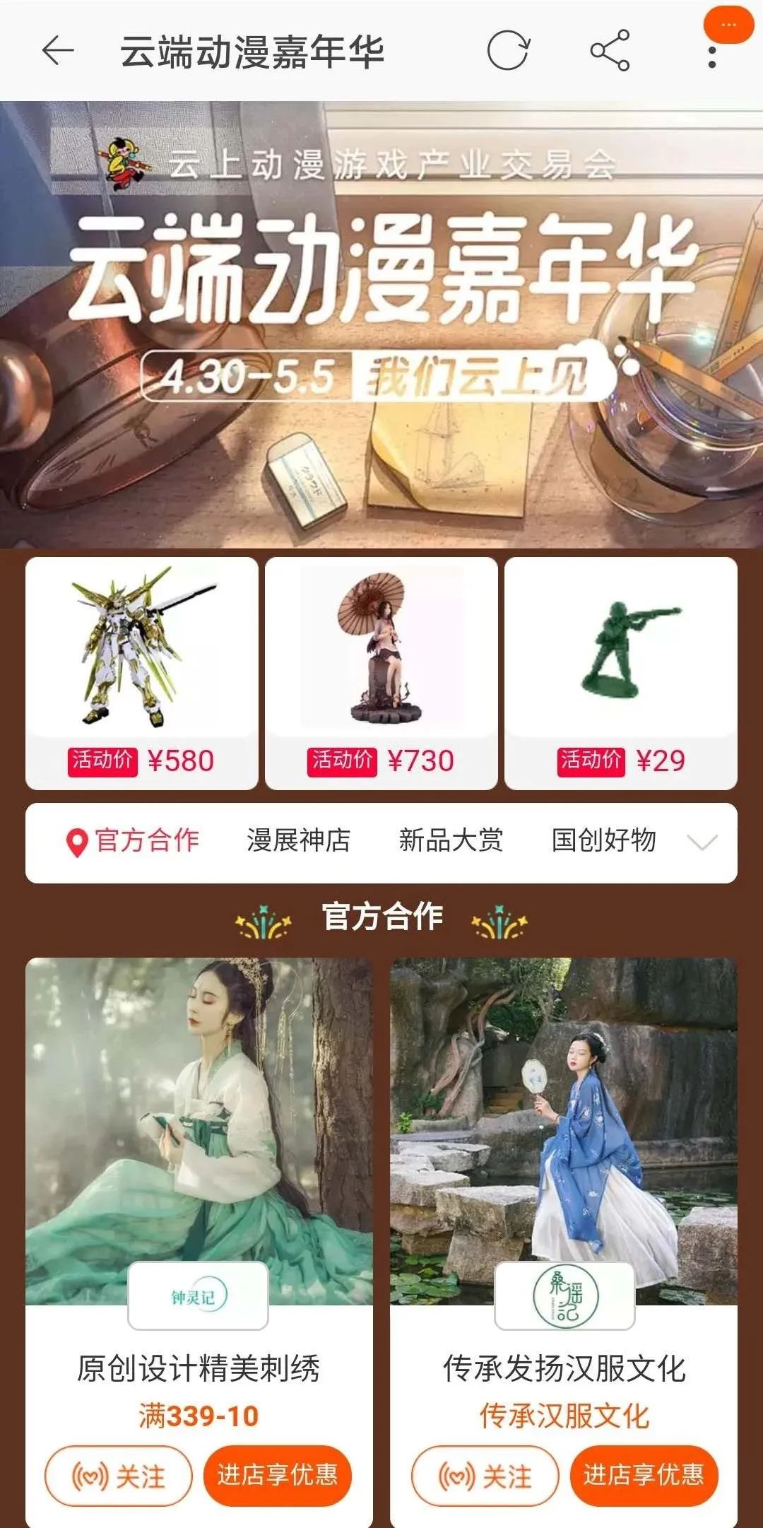 点击展位可查看具体信息 “云端动漫嘉年华” 联合阿里巴巴集团旗下淘宝、天猫推出为期六天的“云端动漫嘉年华”活动, 集聚近千商家、十万货品,千余新品首发,打造假日文化消费新模式。