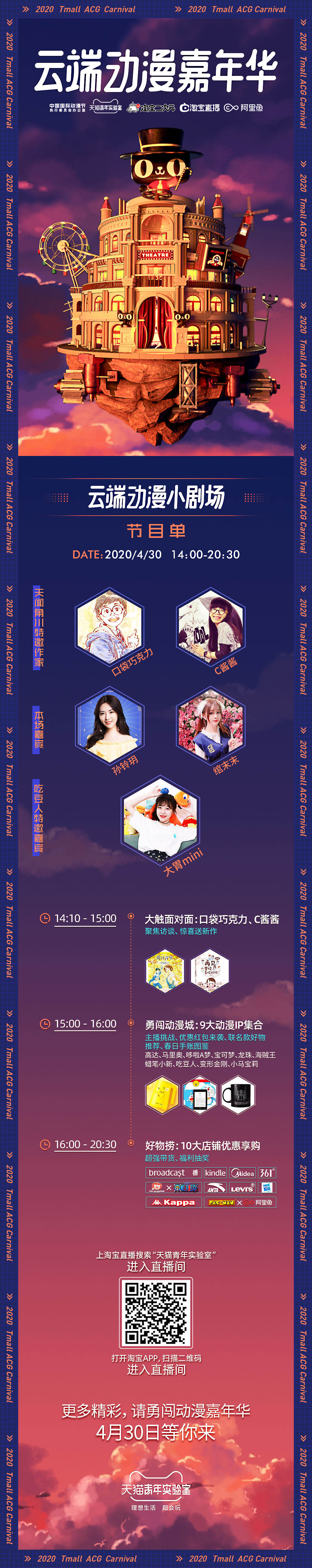 逛漫展怎么能少的了作家大触面对面、好看的Coser、汉服小姐姐呢?云端动漫小剧场一次性满足你!这里不仅有漫IP独家内容发布、动漫小说作家直播、Coser互动还有多款动漫IP联名商品独家发售,边看边买。打开节目单,锁定淘宝直播-天猫青年实验室直播间,超多精彩内容不容错过!