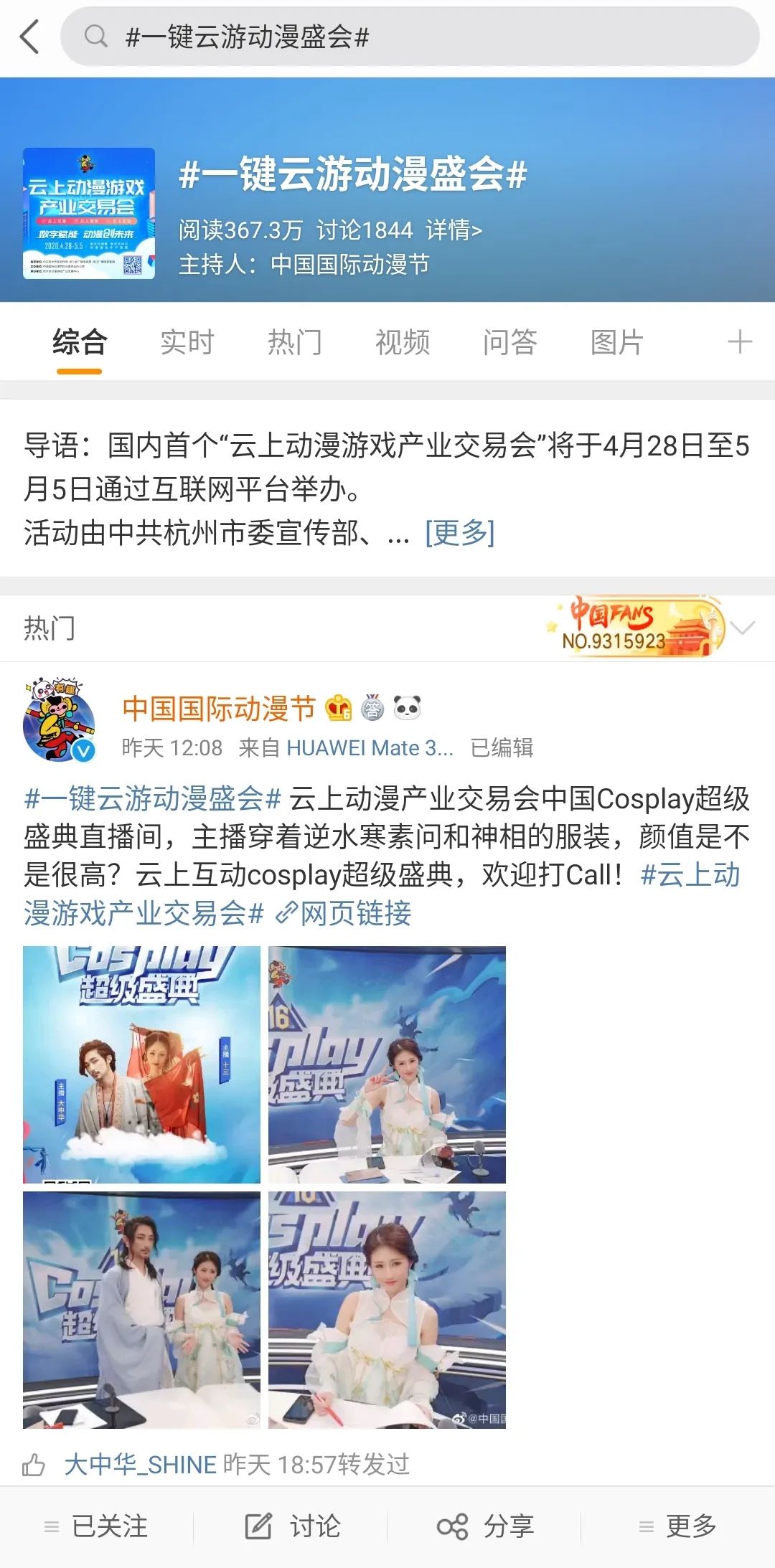 今天“云上动漫游戏产业交易会”进行到第四天了,一直关注着的小伙伴们别忘了看看#一键云游动漫盛会#话题哦,有关这场动漫盛会的新鲜有趣消息、直播动态、互动福利等都在这儿了哈✨ 若是“云上动漫游戏产业交易会”有什么感想或是表白国漫君(划掉),都可以带上#一键云游动漫盛会#尽情发表。