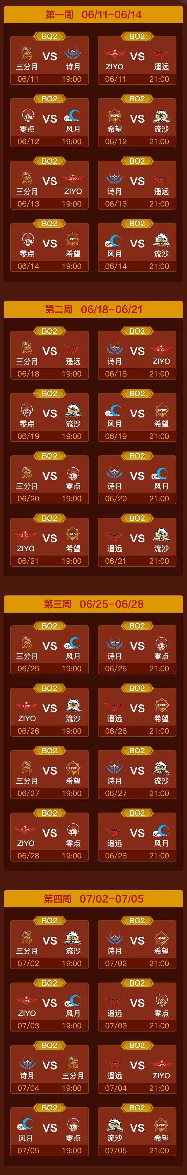 | hello~各位小伙伴们,每天都有人在后台留言催问梦梦“MPL什么时候开赛”,了解梦梦的人都知道,梦梦从不会辜负各位童鞋的爆料期待,今天咱们就来说一说MPL夏季赛!图片 《梦三国2》2020年MPL夏季赛-常规赛将于6月11日(本周四)晚19:00燃情开战,去年星赛季的冠军“三分月”和亚军“诗月”,两支实力强劲,“火药味十足”的战队将为大家带来揭幕大战! 本次比赛采用的是5月28日更新的游戏版本,据梦梦收集到的信息,本次比赛无禁用物品和英雄(如有变化以赛事运营团队通知为准)。 常规赛共计28个比赛日,8支MPL夏季赛战队:三分月、诗月、希望、遥远、ZIYO、流沙、风月、零点,将进行Bo2双循环积分赛。常规赛结束时,积分排名前4名的战队将获得MPL季后赛的资格;第5、6名战队将进行保级赛;而第7、8名战队则会直接淘汰,降级至MSPL秋季赛。 MPL夏季常规赛赛程一览 第一周 - 第四周 赛程对阵安排