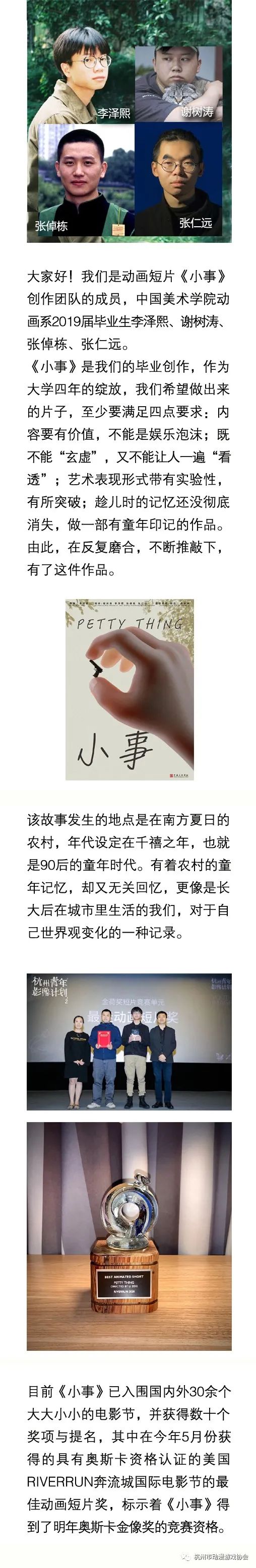 | 今年5月,中国美术学院传捷报,该院2019年毕业生创作的动画短片《小事》取得了明年奥斯卡金像奖的竞赛资格。这件作品由李泽熙和他的三位小伙伴合作,一年前,他们完成毕业创作《小事》并频获嘉奖,完结了人生中毕业的大事。一年后,作为校园骄子的他们,在市场风雨中经历了什么?让我们一起欣赏佳作、走进创作的背后。 剧情概要 一个夏日的寻常午后,几个孩子在村里玩耍。 喜欢玩枪战的他们无意间捡到一把仿真枪, 村子里一派安详宁静,小孩扔掉地瓜皮,黄狗好奇地闻了闻。 一个男孩好奇地扣下了扳机。 图片 枪声响彻林间,惊飞了技上的鸟儿。 图片 晚上,老电视里播放着战争中原子弹爆炸的纪录片。 战争的残酷和毁灭性,让孩子们看傻了。 导演创作解读
