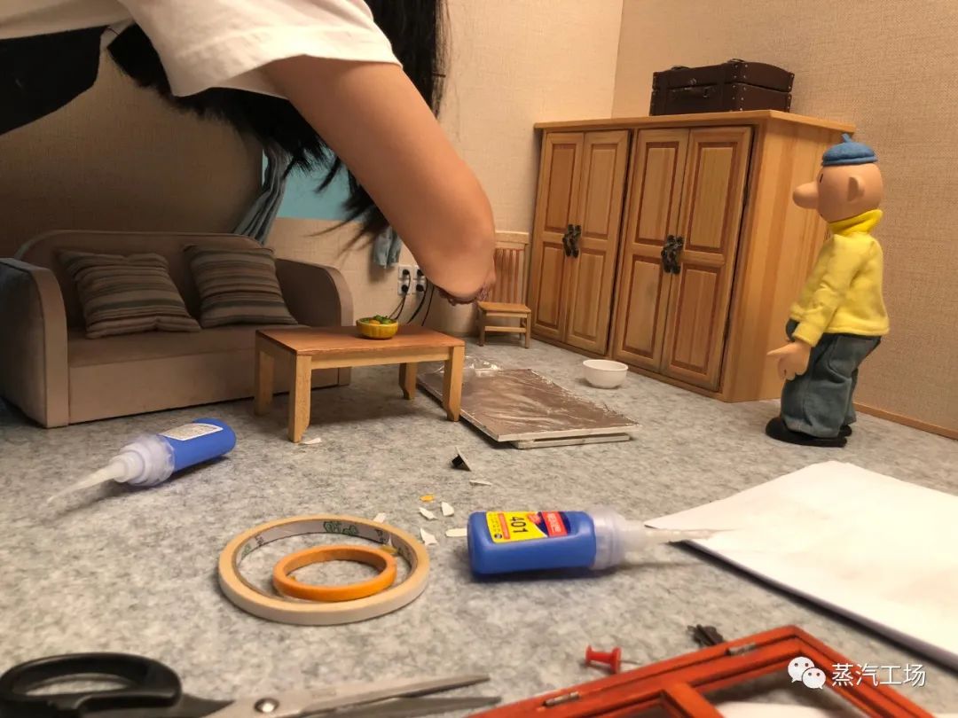 ▲迷你宜家小台灯 《呆瓜兄弟》是全定格动画拍摄的,动画师需要一帧一帧,一点一点给偶摆动作拍摄。虽然动画角色只有主角两个,但阿呆和阿瓜这两位无敌“破坏王”经常做一些超高难度的动作。 ▲上图动画师在拍摄扫帚戳地上的冰,正用笔刀一点一点制作冰碎裂的动画
