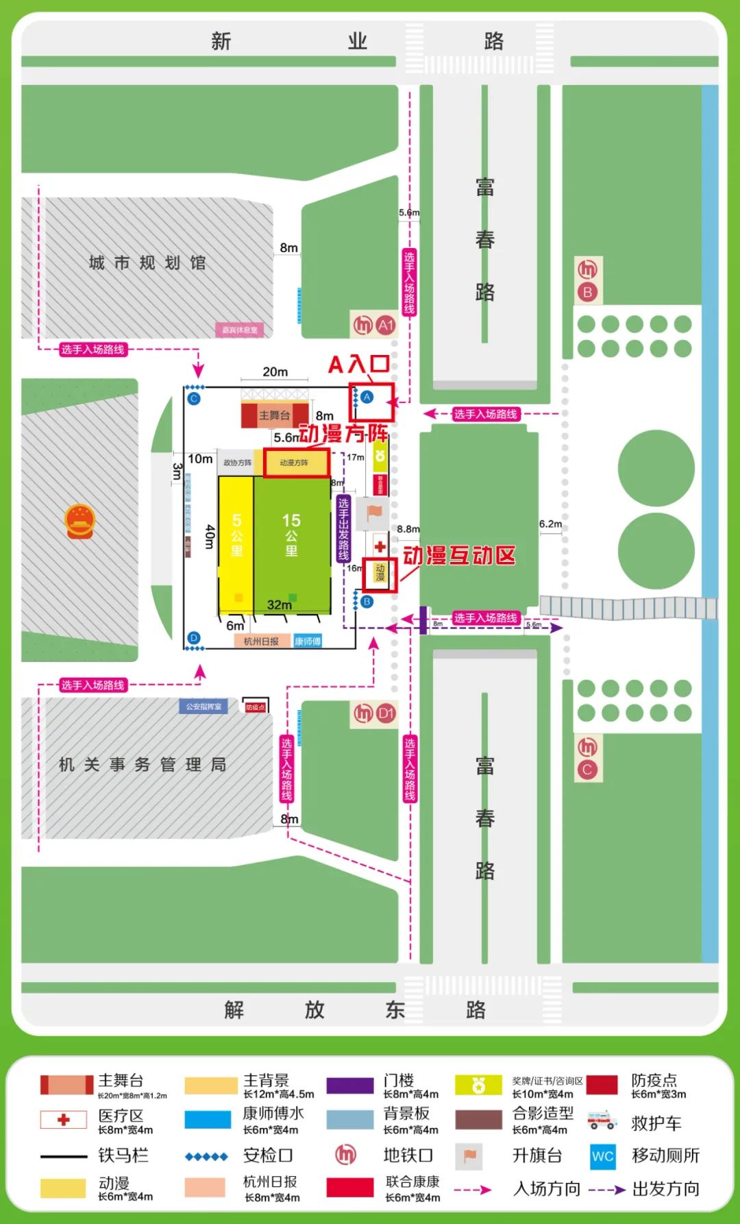 先小小剧透一下: 参与本次动漫毅行现场互动, 有机会获得精美礼品哟! 下面,国漫君就为大家奉上 今年份的活动攻略, 拿好小本本记下哟! 活动时间&地点 活动时间:2020年10月31日(星期六) 活动地点:钱江新城市民中心南广场 集合/出发须知 入场安检/集合 1.动漫方阵位于主舞台前右侧。各位选手可从A安检口就近入场。 2.倡导绿色出行,乘坐地铁前往的选手可从市民中心站A1口出站。 3.入场时需展示实名健康码并测量体温,符合要求方可进入。入场及开幕式时需佩戴口罩。 4.请统一着动漫方阵服装,并将号码布提前佩戴于胸前位置。 特别提醒:缺少、丢失号码布者一律不得入内,也不得在安检处逗留,不能转让号码布。 5.各位选手请于7:50前入场。 现场布局图