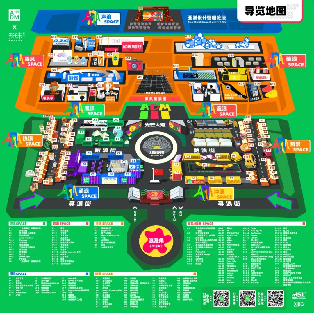 入场后记得先转个身,和来自杭城小朋友们画的太阳合个影吧~为向大众传递积极阳光的力量,ADM携手娃哈哈发起“画太阳 种希望”的活动,入围作品就“藏在”入口处大屏的背后哦。 沿着光芒大道笔直前进,位于“红太阳广场”正中央的,正是跨界艺术家、多元立体书法创始人麻进为本次ADM展创作的艺术装置——《太阳的光芒》。 被老杭州称为“红太展览馆”的浙江展览馆,半个世纪来给了无数人希望和能量。在今年这个特殊的年份,ADM联合浙江展览馆,希望再次将源源不断的能量带给大家,一起迎接美好的未来。 装置10m宽X6m高,化身“能量补给站”,通过两个交织在一起的“光环”体现“红太阳”的能量辐射,为你的能量加持,体验1秒能量爆棚!(晚上合影,朋友圈点赞率更高哦~) 艺术装置的外围便是专为走秀活动设置的环形秀道,极盒契时尚走秀、微店Park国风走秀、饿了么潮流走秀都将轮番在这里上演,有想看的show记得掐点蹲前排哦~ 02 — 六大主题区域 — 日均万步逛到过瘾 今年ADM聚焦艺术、科技、潮流、美食,将户外广场划分为流浪街区、造浪街区、涌浪街区、冲浪街区以及热浪街区,浙江展览馆则化身乘风破浪馆。如何根据自己的“属性”愉快逛展?请看下面这份导览地图!