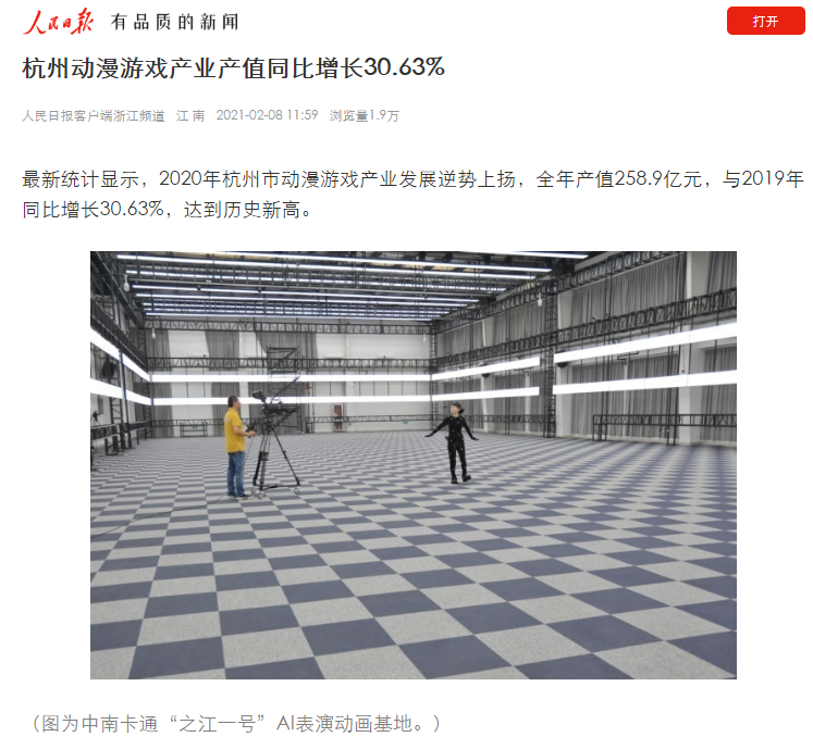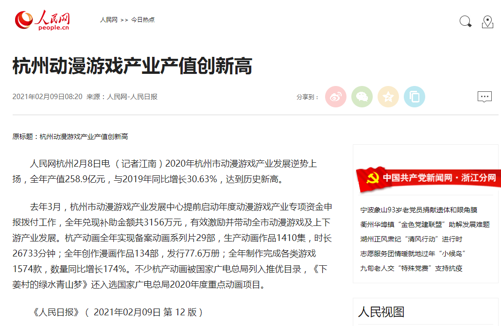 浙江新闻 《浙江新闻》网站2月8日发文《超250亿元 2020杭州动漫游戏产业产值创历史新高》。
