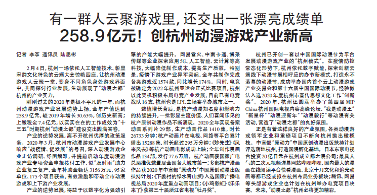 《人民日报》2月9日第12版刊出《杭州动漫游戏产业产值创新高》。