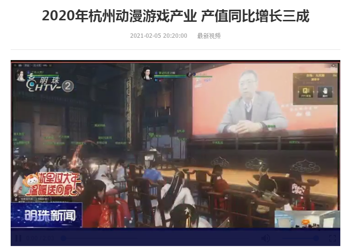 杭州电视台 杭州电视台西湖明珠频道2月5日在《明珠新闻》中播出《2020年杭州动漫游戏产业 产值同比增长三成》。