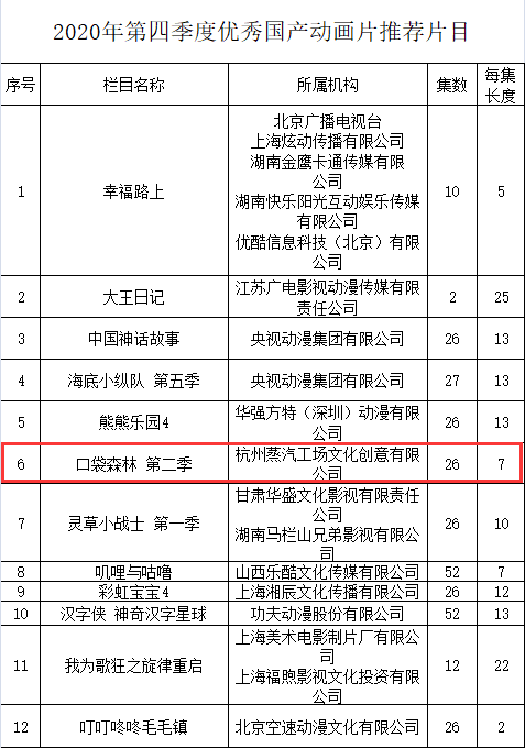 | 近日,国家广播电视总局发布《关于推荐2020年第四季度优秀国产电视动画片的通知》(广电办发〔2021〕67号),经省级广播电视主管部门、中央广播电视总台推荐,国家广播电视总局组织专家评审,共12部国产电视动画片为2020年第四季度推荐优秀作品,其中由协会会员单位蒸汽工场出品的杭产动画《口袋森林第二季》光荣上榜!