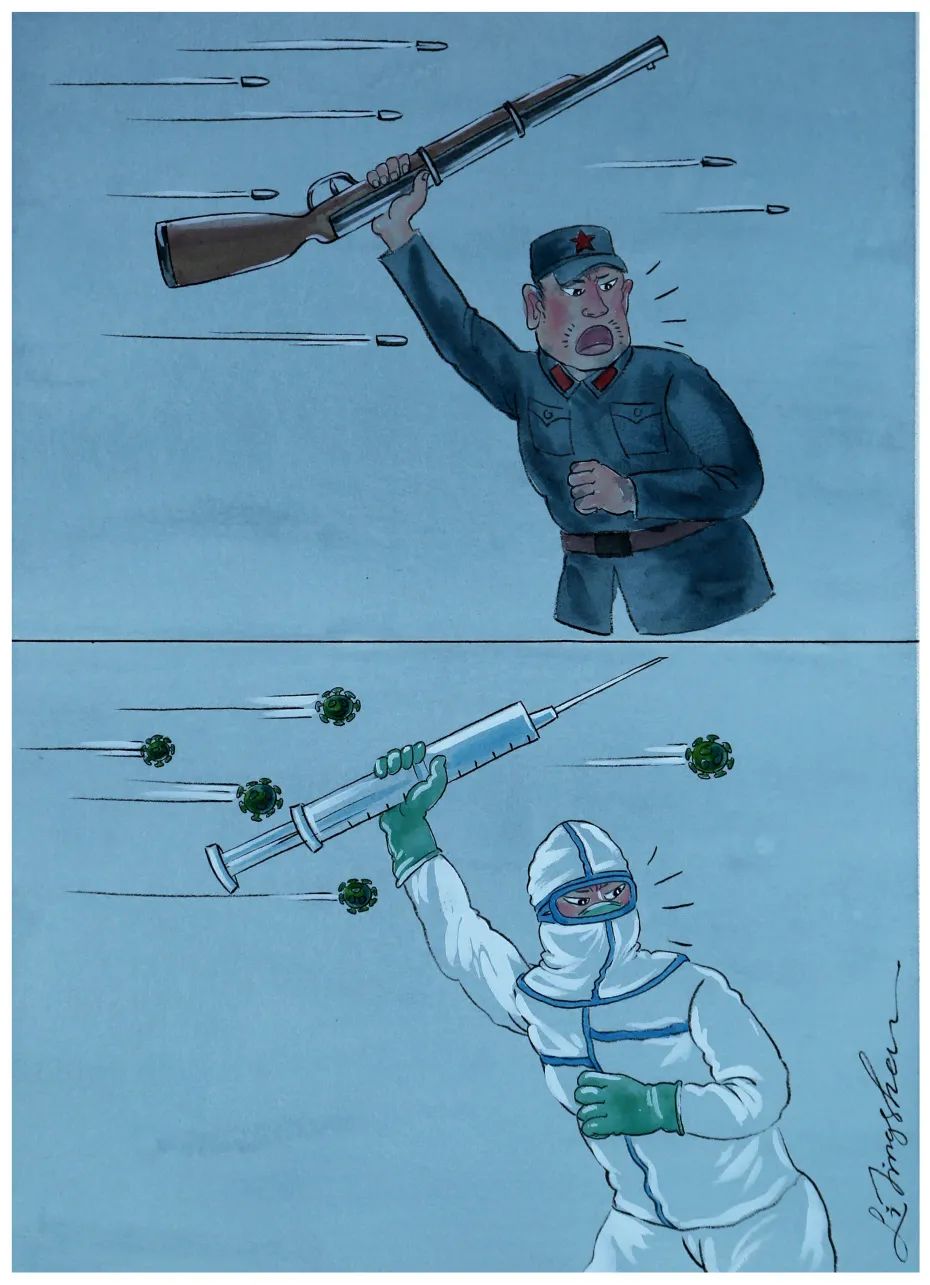 该作品通过同时体现革命时期拿枪战斗的红军战士和新时代与病毒作斗争的医护人员,寓意了不同时代背景下共产党员在面对各种困难和挑战时,都能够响应时代的召唤,做到临危不惧、冲锋在前、享受在后。
