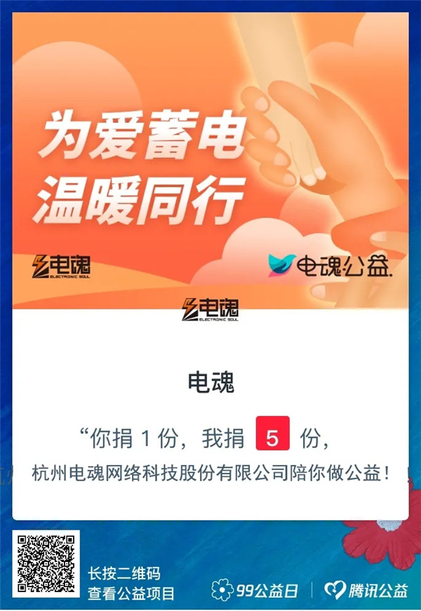 活动时间 2021年9月7日-2021年9月9日 未来,电魂公益会继续不忘初心,砥砺前行。 希望能携手更多有爱心的小伙伴,一起为爱蓄电,温暖同行,把温暖传递到更多有需要的角落。 |