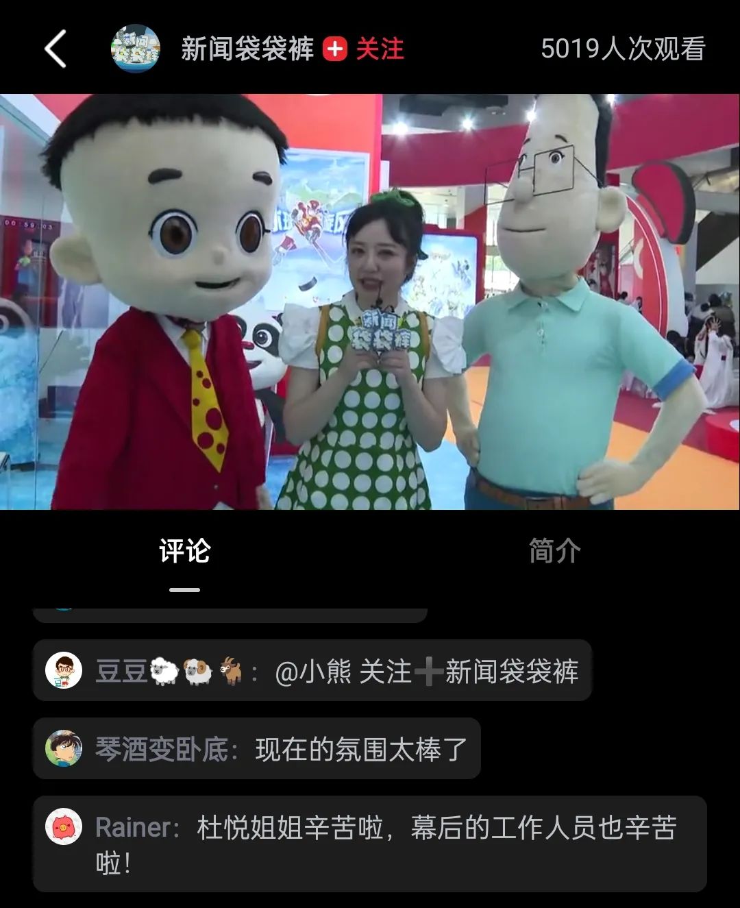 《新闻袋袋裤》主持人杜悦姐姐直播逛展 《新闻袋袋裤》的杜悦姐姐也来直播啦。直播间改成配音间,杜悦姐姐和小朋友一起体验了给动画片配音的环节:“这让我们体会到幕后动漫人的艰辛,制作一部好动画片,每一个工种都特别不容易。”直播探馆期间,杜悦姐姐还偶遇了一位央视动漫的忠实粉丝。小伙子自称是“看着央视的动画片长大的”,“感谢央视动画片陪伴一代代孩子健康成长。”观众的肯定和口碑,正是央视动漫人不懈努力的动力源泉。 央视新闻记者穿汉服做直播 因疫情防控要求,今年动漫节活动在一定程度上进行了“瘦身”,许多动漫迷也因此不能到场亲自参与。在会场里,总能看到许多挂着总台工作牌、拿着话筒、扛着摄像机的小姐姐小哥哥,他们或直播探馆,或拍摄Vlog,或制作专题短片,或录制访谈节目。 作为主办方之一,中央广播电视总台聚合多角度、多类型、多语种报道,多平台融合传播,给广大动漫迷带来身临其境的“沉浸式”体验,让大家足不出户也能“玩转”动漫节。