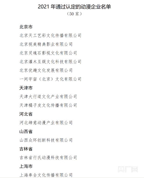 三部门:2021年共有50家动漫企业通过认定 央广网北京12月2日消息 近日,文化和旅游部、财政部、税务总局公布2021年通过认定动漫企业名单的通知。根据《动漫企业认定管理办法(试行)》的有关规定,经审核,2021年,共有50家动漫企业通过认定。通知明确,文化和旅游行政部门认真做好“动漫企业证书”的发放工作,按照有关规定对通过认定的动漫企业进行年审。符合条件的动漫企业,可按照规定享受相关税收优惠政策。 央广网 2021年12月03日