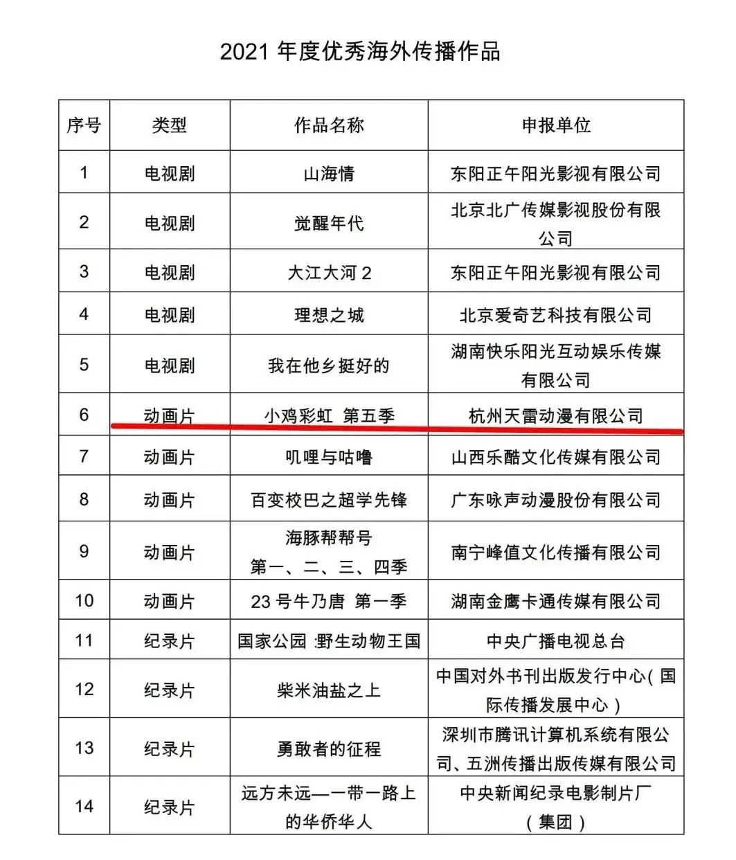 | 近日,国家广电总局办公厅发布《关于2021年度优秀海外传播作品评审结果的通知》(广电办发〔2021〕398号), 共有20部被评定为2021年度优秀海外传播作品。其中,由杭州天雷动漫有限公司创作的《小鸡彩虹》第五季榜上有名,成为入选的5部动画作品之一,也是浙江省唯一入选的动画作品。