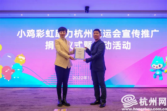 1月14日下午,由杭州本土企业天雷动漫和浙江传媒学院共同打造的小鸡彩虹助力杭州亚运会宣传推广项目捐赠仪式暨启动活动在杭州亚组委举行。该项目成果以“一元捐”的形式赠予杭州亚组委,为“品牌亚运”建设增光添彩。 杭州亚组委副秘书长、杭州市副市长陈卫强,浙江传媒学院党委书记杨立平,浙江传媒学院党委副书记陈永斌,亚组委宣传部部长、市委宣传部副部长许德清,亚组委市场开发部副部长杜梦菲,中国动漫博物馆馆长胡蔚萍,浙江传媒学院副教授、天雷动漫创始人雷涛,天雷动漫联合创始人沈攀等参加了捐赠仪式。