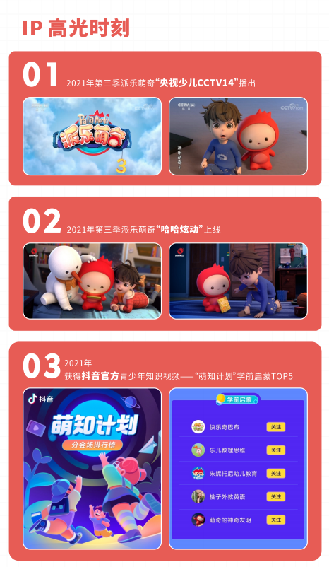 《派乐萌奇》和央视签了四年合同,一年播放一季,目前已全网上线三季,2021年第三季派乐萌奇七月在“哈哈炫动”上线,八月在“央视少儿CCTV14”播出,获得抖音官方青少年知识视频——“萌知计划”学前启蒙TOP5,图文平台阅读量1000w+,视频平台播放量破2亿。不仅有优秀的画面品质,其核心优势在内容概念上的精品和长期化,加上其特有的亮点,神奇的脑洞道具和发人深省的趣味故事,在乐趣氛围下,让孩子轻松接受知识,开始奇思妙想。