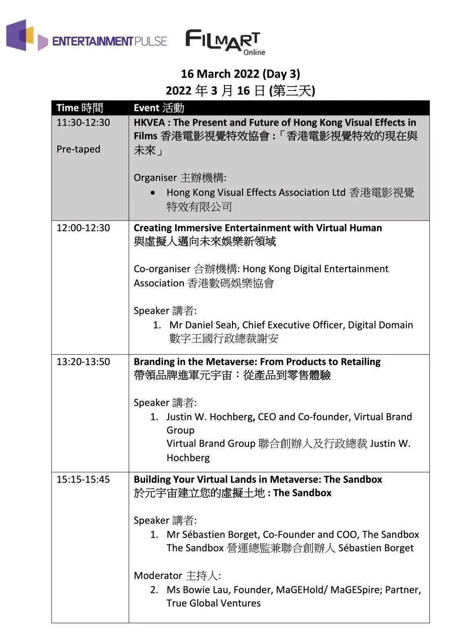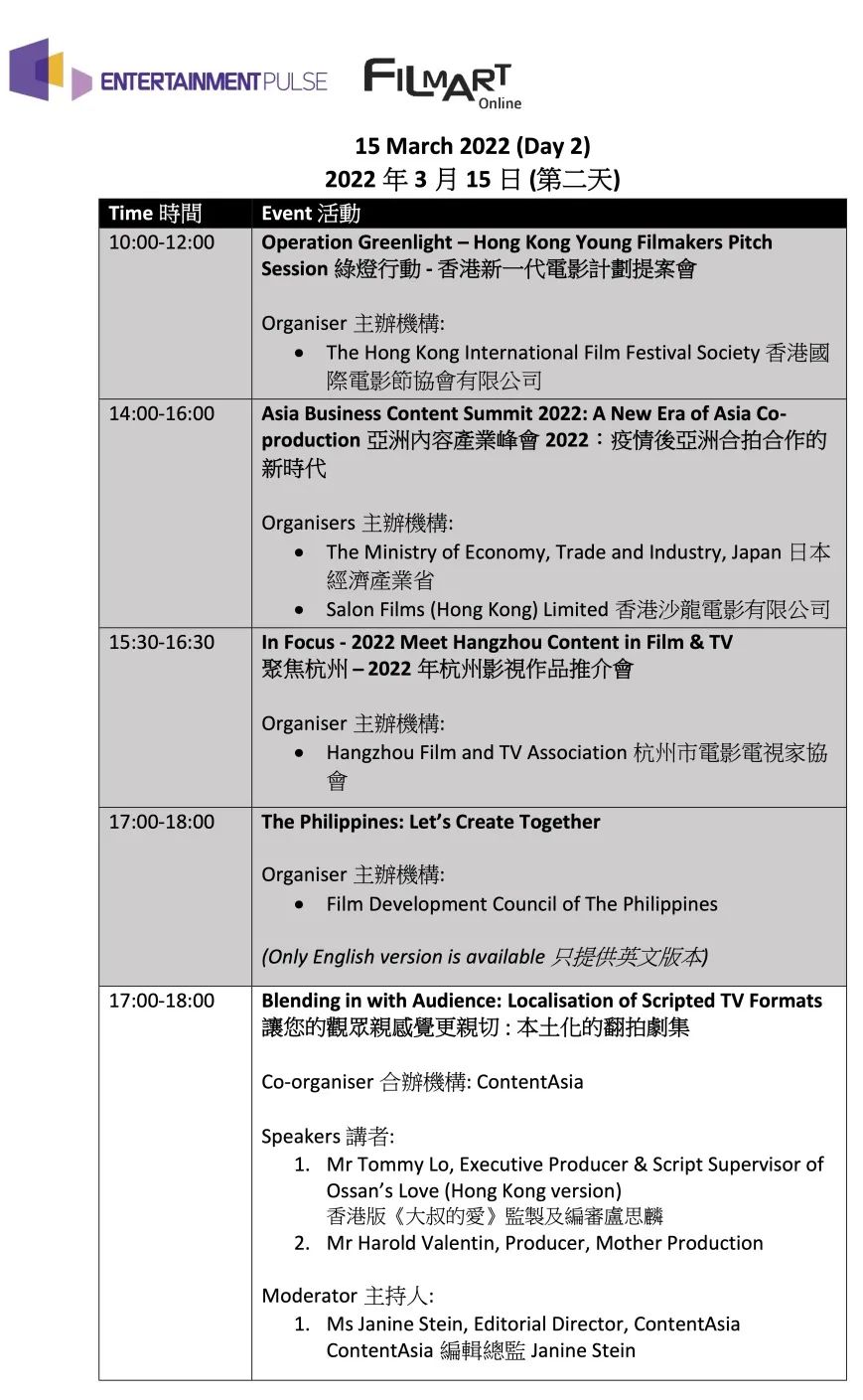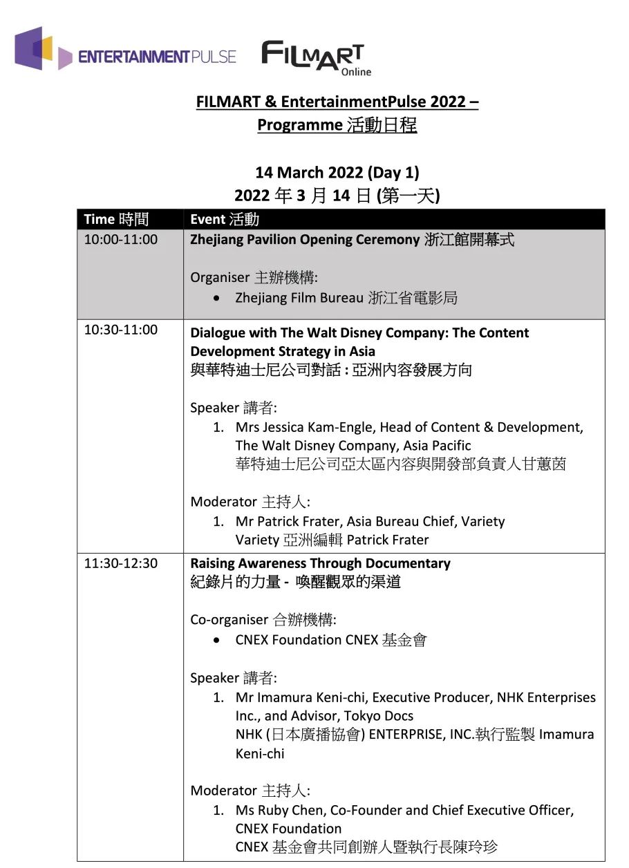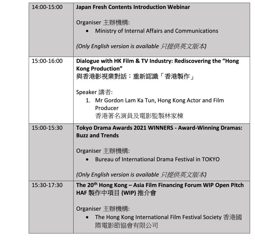 为带给行业工作者更多交流及合作机会,现面向影视动漫游戏全领域具有采购需求的行业人士进行招募,感兴趣的朋友可通过杭州馆注册成为2021年香港国际影视展买家,将免费参与以下论坛活动。 如何报名 报名信息:姓名+邮箱+公司+职位,发送至 收件邮箱:edward.shen@megamedia-china.com 报名费用:免费 截止时间:3月10日 与会者业务内容涵盖:电影、电视、动画、纪录片、数码娱乐/游戏、数码效果及音乐发行及制造公司、戏院商,无线电视/有线电视/收费电视及卫星广播公司,电台广播,网上平台,制作及后期制作服务,影视技术及器材,娱乐事业服务供应商,专利授权公司,电影节/电影展主办机构,行业协会,融资,娱乐事业专业服务等 2022 活动日程