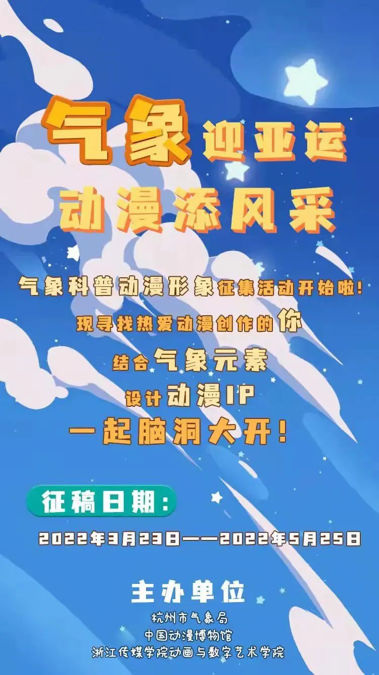 3月23日,是第62个世界气象日。今年世界气象日主题为“早预警、早行动:气象水文气候信息,助力防灾减灾”。为充分发挥动漫为气象行业的赋能作用,借助动漫形象加强气象科普传播,提升公众识别气象、防御极端天气事件影响的意识,杭州市气象局、中国动漫博物馆、浙江传媒学院动画与数字艺术学院联合推出气象科普动漫形象征集活动。该项活动也将作为中国动漫博物馆举办的动漫科技周系列活动之一。 具体比赛信息如下,热爱动漫的你快来看看吧! 活动主题: 气象迎亚运 动漫添风采 参赛对象: 动漫创作爱好者 大赛内容: 结合气象元素,设计动漫IP 主办单位: 杭州市气象局 中国动漫博物馆 浙江传媒学院动画 与数字艺术学院 征稿日期: 2022年3月23日 ——2022年5月25日 征稿要求: (1)作品主题:动漫人物形象要有利于气象知识传播,可结合风雨雷电等气象要素或传统文化;在整体外观和感觉等方面要和谐统一,富有创造力且易于识别;要有较强的可塑性,形象需活泼可爱、富有亲和力,需受广大青少年欢迎。除此之外,可酌情为其制作相对丰富的延展(如更多的衍生IP形象、场景等)。 (2)作品尺寸:3200px * 1800px(横板),参赛作品需保留300dpi分辨率的位图源文件或矢量文件,需注意元素尽可能独立分层,以便后期编辑使用。 (3)作品阐述:需对参赛作品进行说明,不少于300字,包括设计作品的背景、寓意、元素应用、创作理念等(请扫描或长按识别以下二维码下载征集活动申报表)。 图片 (4)作品版权:参赛者需保证其作品不存在或可能存在违反法律法规等规范性文件规定、侵犯任意一方版权及其他合法权益等情形,亦不存在或可能存在违背公序良俗、伦理道德、社会公德、宗教教义或可能造成不良社会影响等情形。 投稿方式: 请将完整的参赛作品 包括作品申报表 发送至本次大赛指定邮箱 【943777752@qq.com】 联系电话:0571-86050639 评审规则: 本次大赛将由特邀专家评定, 将于6月中旬公布奖项 奖项设置: 一等奖1个,奖励10000元; 二等奖2个,各奖励3000元; 三等奖3个,各奖励1000元; 优秀奖若干。 期待大家的精彩创作呦! |