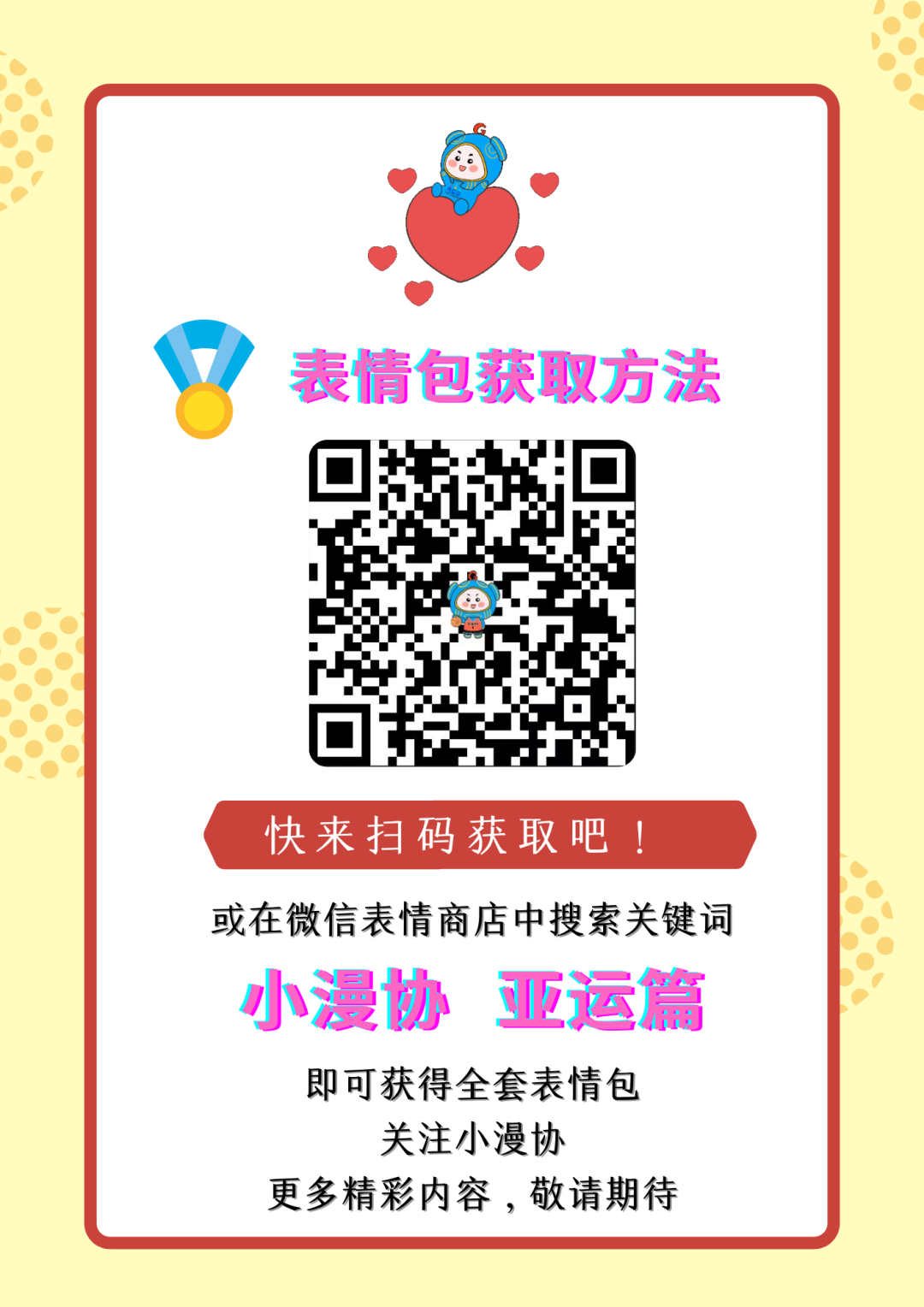 动漫助力亚运! 今年是杭州的“亚运年”,作为一座历史悠久的文化名城,和充满新鲜血液的活力之城,杭州一直在积极进行各项亚运筹办工作,期待以最佳姿态迎接世界的聚焦。 距杭州2022年亚运会开幕日益临近,杭州也将成为继北京和广州之后我国第三个举办亚运会的城市。钱塘江畔、西子湖边、大运河旁……漫步在杭州的街头巷尾,随处可见扇面造型的亚运会会徽和拍照打卡的人们,每一个人都在期待亚运盛会的到来,亚运氛围日渐浓厚。 这场“中国特色、浙江风采、杭州韵味、精彩纷呈”的体育文化盛会已越来越近,“小漫协”作为这座美丽城市的一份子,将以最饱满的热情,宣传亚运,服务亚运和奉献亚运,积极创意动漫与亚运盛会的跨界融合,为杭州亚运会的成功举办造势助力。 在小文工作室的努力创意下,治愈系“小漫协”亚运表情包热血登场。动漫人们速度扫码下载,和“小漫协”一起追逐杭州的亚洲雄风。