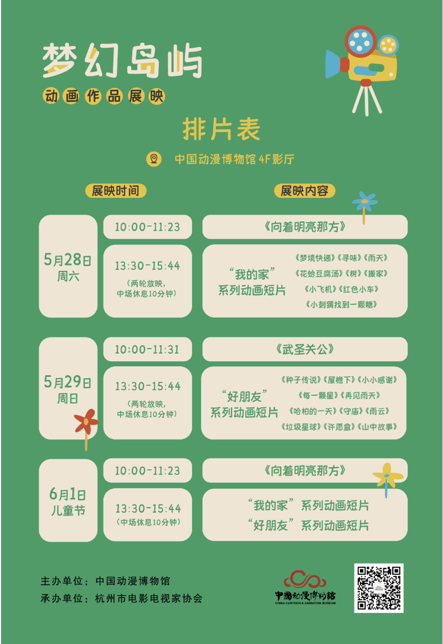 | 六月是专属于小朋友的节日。在第72个国际儿童节到来之际,中国动漫博物馆将为杭州热爱动画的大朋友、小朋友带来一场动画盛宴。此次活动邀请了2部动画长片、20部动画短片,以“梦幻岛屿”为主题,展示童年时代的纯真、细腻与勇气。这些作品包含了国内首部原创绘本电影《向着明亮那方》、由蔡志忠执导,特别适合三国迷观看的动画电影《武圣关公》,及20部青年动画导演所带来的关于家庭、自然和友情的动画短片作品。诸多短片作品在杭州是首次展映,快到动画的怀抱中重温童年之美吧! 活动将在5月28日、29日周末与6月1日儿童节举行,免费对公众开放。在六一儿童节当天,我们还将邀请气球手工艺达人为小观众送上可爱、独特的小礼物。通过“中国动漫博物馆”微信公众号预约当日参观名额,并在馆内领取观摩券后可免费观看。 温馨提示:感兴趣的观众请看清楚排片表,预约是以半天为单位。如想看本周六上午《向着明亮那方》,请预约28日上午的号。如果预约不到本周末场次的观众不要着急,除《武圣关公》之外,所有的作品将在六一当天进行二轮重映。大家可以根据自己的时间进行预约。