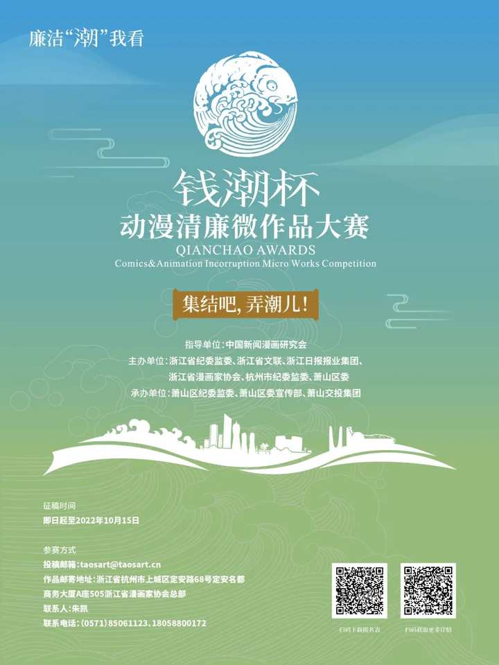 | 为充分发挥廉洁文化的教育、引导、激励、浸润和约束功能,进一步丰富廉洁文化优质产品和服务供给,营造全面从严治党的良好社会氛围,第二届“钱潮杯”动漫清廉微作品大赛再次“起航”,面向全国征稿。 大赛由中国新闻漫画研究会指导,浙江省纪委监委、浙江省文联、浙江日报报业集团、浙江省漫画家协会、杭州市纪委监委、萧山区委主办,萧山区纪委监委、萧山区委宣传部、萧山交投集团承办。 本届大赛以廉洁“潮”我看为主题,以我们的中国梦、我们的廉洁观、我们的新风尚、我们的共富路、我们的幸福经为选题,用动漫艺术表现中央八项规定精神、清廉家风、亲清政商、共同富裕、亚运护航、红色根脉、宋韵传统等廉洁文化相关内容,生动描绘新时代新征程中,全面从严治党纵深推进的新气象、纪检监察工作的新成效、党员干部的新担当、人民群众的新期盼、风清气正的新风尚。 即日起,大赛作品征集通道正式开放,面向全国征集以漫画、插画、公益海报为主的平面类作品和运用各种动漫创作的视频类作品,作品截止投稿日期为2022年10月15日。