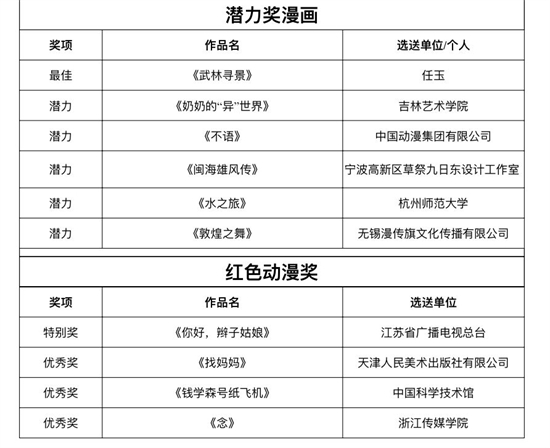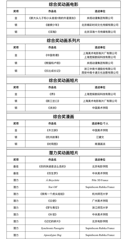 央视动漫集团有限公司选送的《新大头儿子和小头爸爸5我的外星朋友》获综合奖动画电影金奖,上海美术电影制片厂有限公司、上海宽娱数码科技有限公司选送的《中国奇谭》获综合奖动画系列片金奖,上海宽娱数码科技有限公司选送的《界》获综合奖动画短片金奖,中国美术学院选送的《木兰辞》获综合奖漫画金奖,由江苏省广播电视总台选送的《你好,辫子姑娘》获红色动漫特别奖。此外,12部动画短片、6部漫画获潜力奖。