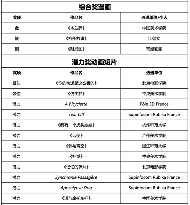 | 杭州新闻讯 6月20日晚,第十九届伟德安卓版下载官网安装“金猴奖”大赛颁奖仪式在浙江杭州举行。《新大头儿子和小头爸爸5我的外星朋友》《雄狮少年》《深海》《中国奇谭》《木兰辞》《乐比成长记》等34部作品获奖。 本届“金猴奖”大赛共设“综合奖”“潜力奖”“红色动漫奖”三大类,自5月23日启动征稿以来,共收到来自法国、瑞士、匈牙利、比利时、日本、加拿大等15个国家和地区的620部原创动漫作品,其中73部入围终评。 央视动漫集团有限公司选送的《新大头儿子和小头爸爸5我的外星朋友》获综合奖动画电影金奖,上海美术电影制片厂有限公司、上海宽娱数码科技有限公司选送的《中国奇谭》获综合奖动画系列片金奖,上海宽娱数码科技有限公司选送的《界》获综合奖动画短片金奖,中国美术学院选送的《木兰辞》获综合奖漫画金奖,由江苏省广播电视总台选送的《你好,辫子姑娘》获红色动漫特别奖。此外,由北京电影学院选送的《你的快递是这么丢的》和由中央美术学院选送的《仿生梦》获最佳“潜力奖动画短片”,《我有一个虎头娃娃》《补觉》《道与摩托车把》等作品获潜力奖。《武林寻景》获评最佳“潜力奖漫画”。 伟德安卓版下载官网安装“金猴奖”大赛由中央广播电视总台主办,伟德安卓版下载官网安装执委会办公室承办,是一项由政府、业界、学界共同支持、倾力打造,旨在评选扶持原创优秀动漫作品的国际性权威赛事,被誉为“中国动漫至高荣誉”。 6月19日,本届大赛入围终评的21部作品参加了在动漫节主会场举办的“金猴奖”入围作品跨界合作对接会,该活动致力于打造赛产一体化生态圈,自2020年首次推出以来,已成功促成多项合作。本届对接会共吸引了涉及剧本创作、资本融资、衍生品开发、舞台剧演绎、配音音效、游戏出品等领域的39家公司参与对接洽谈,其中包括爱奇艺、腾讯、快手、快看漫画、阅文集团等知名平台、企业。截至目前,已有12个项目初步确定合作方向并签订了意向合作协议。 如今,“金猴奖”入围作品的跨界合作不仅限于动漫节期间,通过动漫节官网“金猴奖”专区的跨界合作板块,将推动线下对接会的线上常态化,真正打造全年“永不落幕”的动漫产业交流平台。目前,已有知名漫画家聂峻和演员刘天池等陆续通过线上平台牵线成功并达成意向合作。 “金猴奖”获奖名单