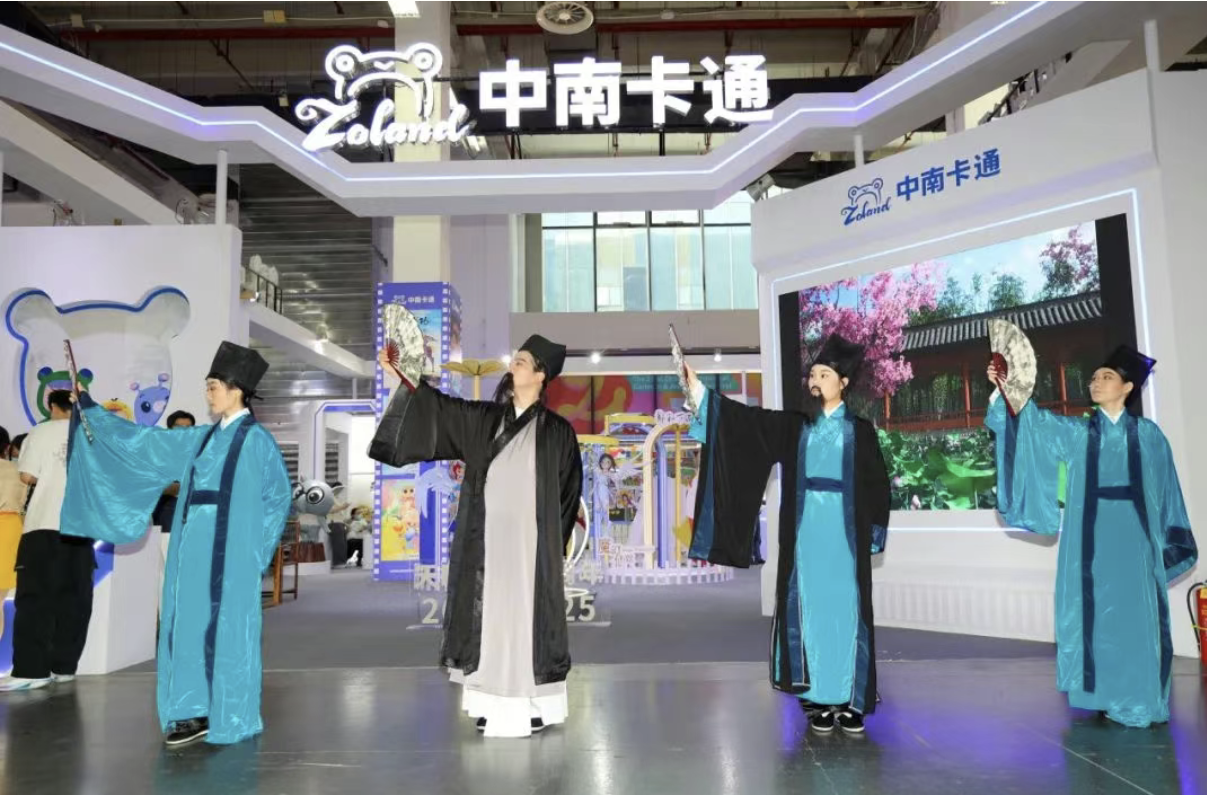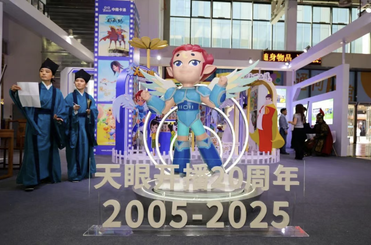 中南卡通展位围绕天眼开播二十周年,设有苏东坡、钱王传奇主题展区,观众既可以和苏东坡AI数字人展开穿越时空的对话,也可以和钱王COSER对弈、互动,参与非遗活字印刷体验等通关打卡互动。国家文化出口基地的METai视听译制平台也在现场进行展示体验,推动商务合作。这里也是“谷子”的世界,动漫爱好者可以与乐比悠悠、天眼、苏东坡、吐司豚等动漫IP周边衍生品“亲密接触”。