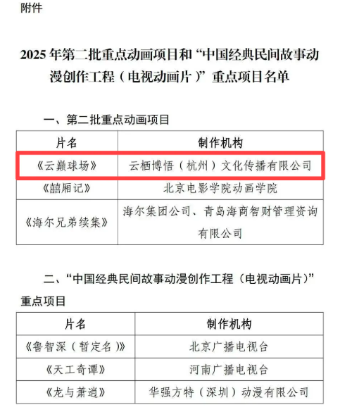 这部杭产动画,入选2025年第二批重点动画项目! 近期,经各省级广播电视行政部门和中央广播电视总台办公厅推荐,广电总局组织专家评审,评出杭产动画《云巅球场》等3个项目为2025年第二批重点动画项目,《鲁智深(暂定名)》《天工奇谭》《龙与萧逍》等3个项目为“中国经典民间故事动漫创作工程(电视动画片)”重点项目,现予以公示。恭喜这部优秀的杭产动画作品!期待未来能涌现更多精彩佳作,让我们携手助力杭州打造国际动漫之都! 国家广播电视总局 2025年10月25日