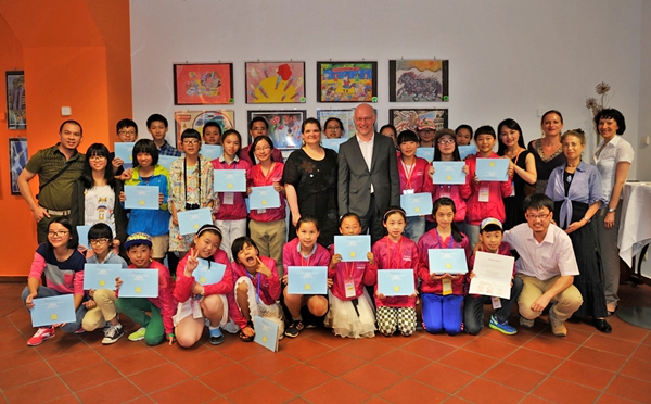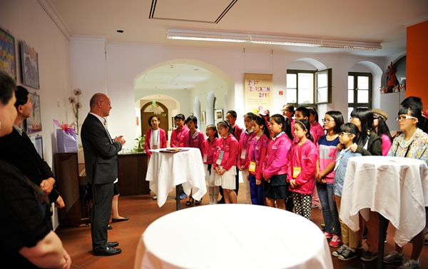参展最后合影 国际巡展系列一 德国站 德国接展单位:希尼卡文化交流公司 参展作品:44件 展览时间:2014年7月22日——8月1日 展览地点:德国 德列斯顿市 独角兽画廊 德国站为期十天的2014“天眼杯”中国国际少年儿童漫画大赛国际巡展(德国站)已顺利落下帷幕。短短十天,经历非常。8月24日下午两点,在德累斯顿青年艺术学校举办了本届“天眼杯”优秀获奖作品的国际巡展(德国站)的开幕式。这是本次文化交流活动的重点和亮点。  德国德累斯顿市独角画廊里的画展开幕式 来自德累斯顿市政府文化处处长、“独角兽”青年艺术学校校长和本届“天眼杯”中方获奖代表们参加了此次揭展开幕式活动。德累斯顿市政府的代表首先致了辞,他谈及对本次活动给予大力支持、对绘画爱好者予以热情鼓励。令人激动的是,他还从参展作品中选出一件其个人印象深刻的画作,结合自己儿时的经历分享了对漫画内容的心得体会,小朋友们在台下满脸赞同,现场一时充满笑声和童趣。 德累斯顿青年艺术学校的校长在发言中谈到了关于本次展览作品的主题,她非常感慨中德双方能对爱护地球、保护人类文明达成高度一致的共识,并欣喜德累斯顿艺术学校能与杭州青少年活动中心建立合作,共同举办这次巡展,意义重大,期待双方能做进一步地交流与合作。杭州青少年活动中心的带队团长戴春霞老师作为中方代表发言,在表达衷心感谢的同时,期待借助艺术这朵奇葩,使双方的友谊能地久天长,此外还送上了杭州青少年活动中心美术部部长高甬春老师的书画作品和具有中国特色的纪念品等,深受德方喜爱。 最后,由德累斯顿市政府代表一一为我们的参展选手颁发国际参展证书并纷纷合影留念。本次揭展仪式是在一阵阵热烈的掌声中结束的,可喜可贺,更是令人难忘!   |